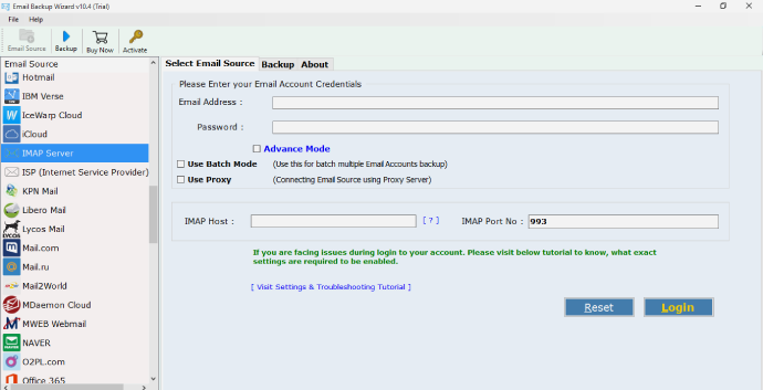 Laden Sie zunächst die Software herunter und starten Sie sie auf Ihrem Windows-kompatiblen Computer. Anschließend wird auf dem Bildschirm ein Fenster mit den E-Mail-Quellen angezeigt. WählenIMAP-Serverals E-Mail-Quelle für die Migration von TalkTalk-E-Mails zu Gmail.