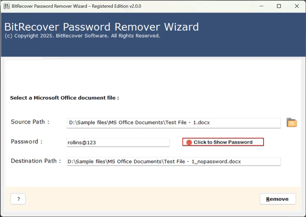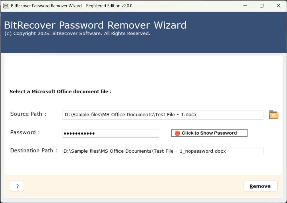 Die manuelle Methode zum Entfernen des Passworts aus DOC ist in Ordnung, funktioniert jedoch möglicherweise nicht für die verschiedenen Arten von Word-, DOC- oder DOCX-Dateien. Wenn Sie unterschiedliche Versionen von Word-Dateien oder -Anwendungen haben, kann es zu Herausforderungen kommen. Eine professionelle Lösung gefällt jedochBitRecover Office Passwort-Entfernerermöglicht Ihnen das Entfernen von Passwörtern aus DOCX-Dateien, DOCX- oder Word-Dateien, unabhängig davon, ob Sie sie mit einer beliebigen Version der Microsoft Word-Anwendung erstellt haben. Es bietet die einfachste und einfachste Möglichkeit, Passwörter innerhalb von Sekunden schnell aus Word zu entfernen.