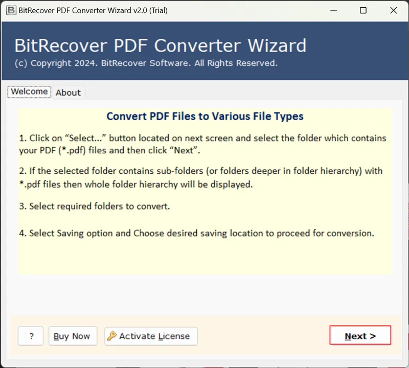 PDF-Konverter-Toolist eine der zuverlässigsten Lösungen vonBitRecoverum defekte PDFs zu reparieren oder beschädigte PDF-Dateien einfach wiederherzustellen. Dies ist eine erstaunliche Lösung, die Ihnen hilft, beschädigte PDF-Dateien problemlos und nahtlos zu öffnen. Ganz gleich, aus welchem ​​Grund Ihre PDF-Datei beschädigt ist, diese Lösung konvertiert Ihre PDF-Dateien in ein Dateiformat Ihrer Wahl.