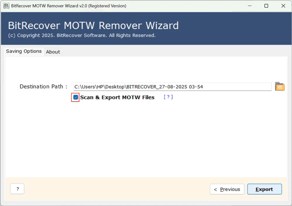 - Aktivieren Sie dann die Option „MOTW-Dateien scannen und exportieren“ und klicken Sie auf „Entfernen“.