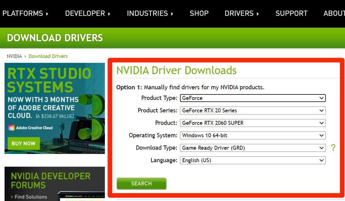 - Verwenden Sie zum Aktualisieren der NVIDIA-Grafik dieNVIDIA GeForce-ErlebnisSoftware. Für den manuellen Download verwenden Sie dieNvidia-Downloadcenter.