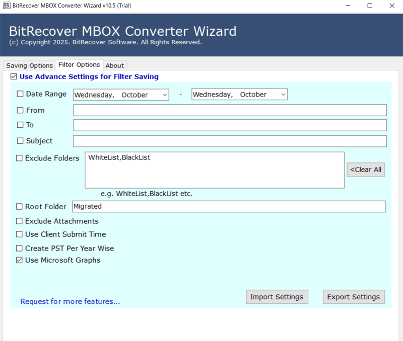 • Erweiterte Filter:Die erweiterte Filteroption hilft Benutzern, ihre MBOX anhand verschiedener Parameter wie Datumsbereiche, Betreff, Absenderinformationen und Empfängerdetails zu trennen. Dies hilft Benutzern, ihre Daten auf der Grundlage verschiedener getrennter Dateien zu trennen und zu organisieren.