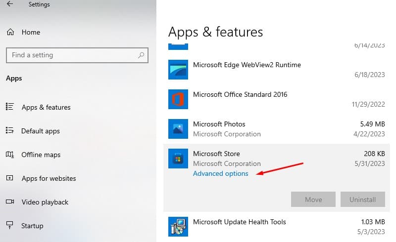 - Wählen Sie "Microsoft Store" aus, um die Optionen zu erweitern, und klicken Sie auf den Link „Erweiterte Optionen“.