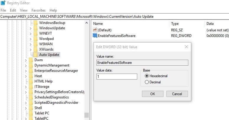 - Doppelklicken Sie auf AktivaDeFeaturedSoftware und ändern Sie den Wert auf 1.