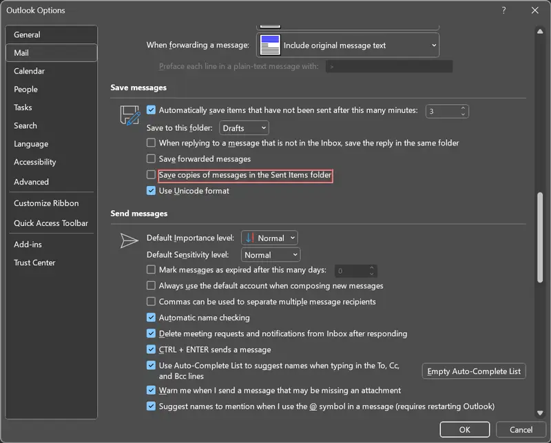 - Gehe zumNachrichten speichernAbschnitt unddeaktivierenSpeichern Sie Kopien von Nachrichten im Ordner „Gesendete Objekte“.