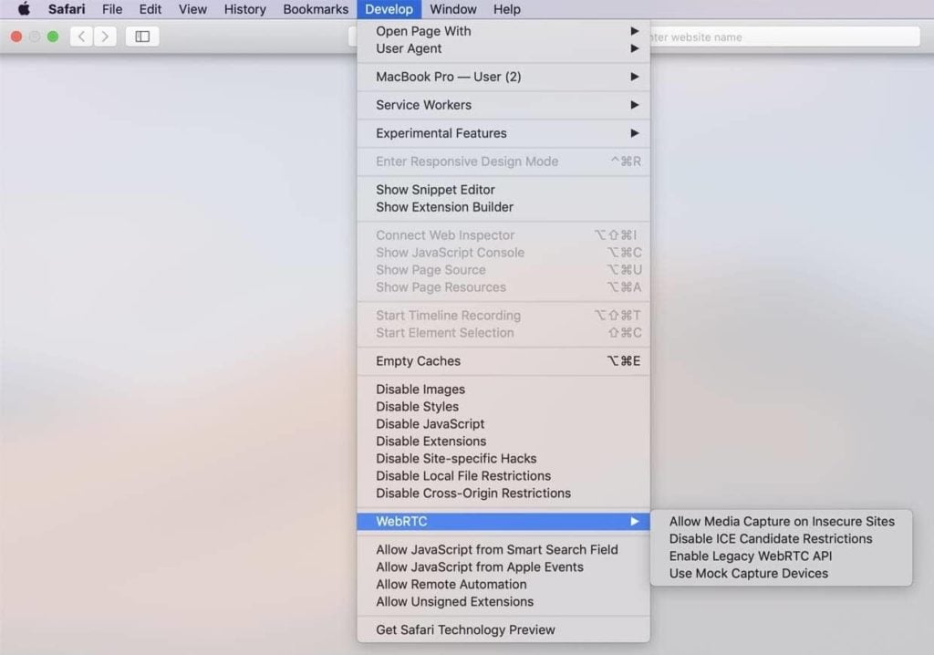 Navigieren Sie zu „Entwickeln' Tab und gehen Sie zum 'WebRTC' Option.