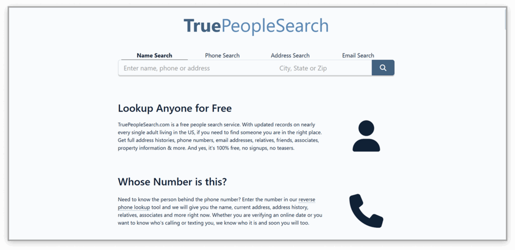 TruePeopleSearch ist eine kostenlose Online-Personensuchplattform. Sie sammelt und veröffentlicht personenbezogene Daten der Nutzer, darunter Name, Adresse, Telefonnummer usw. Die Plattformbietet kostenlosen Zugang zu den persönlichen Daten der Bürger– Suchen Sie einfach nach dem Namen, und Sie werden alles über diese Person erfahren.