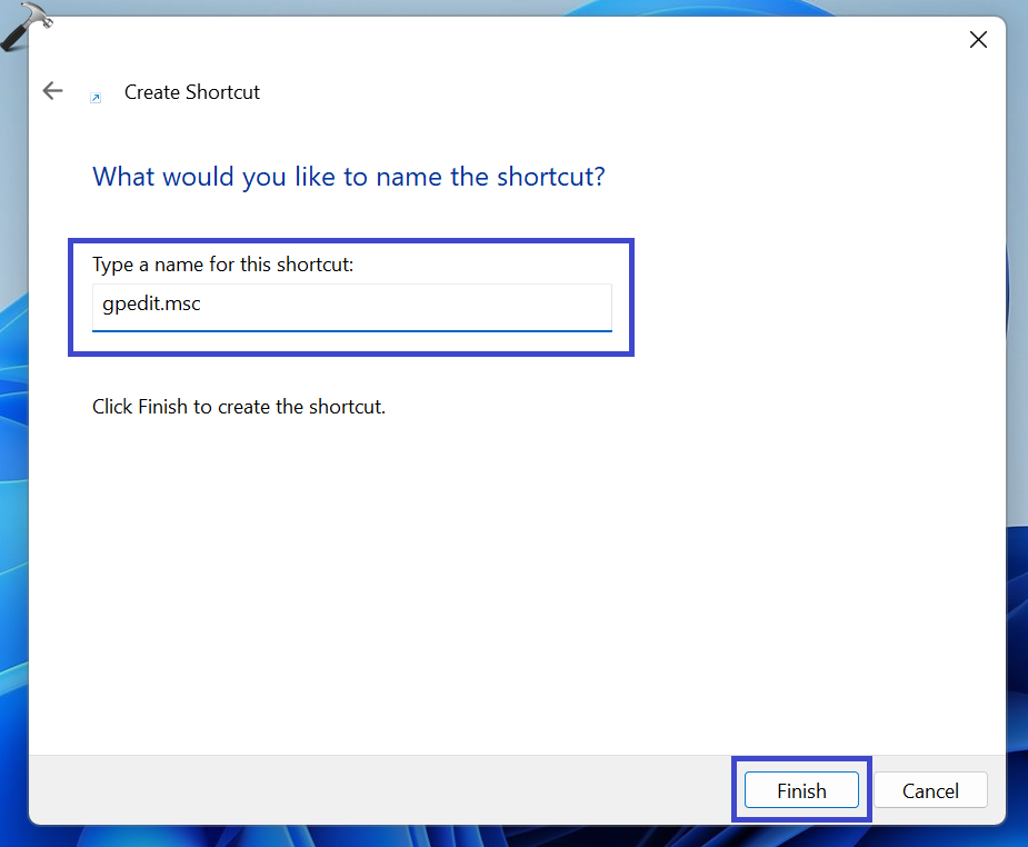 3. Unter dem „Geben Sie einen Namen für diese Verknüpfung ein“, geben Sie „gpedit.msc“ ein.