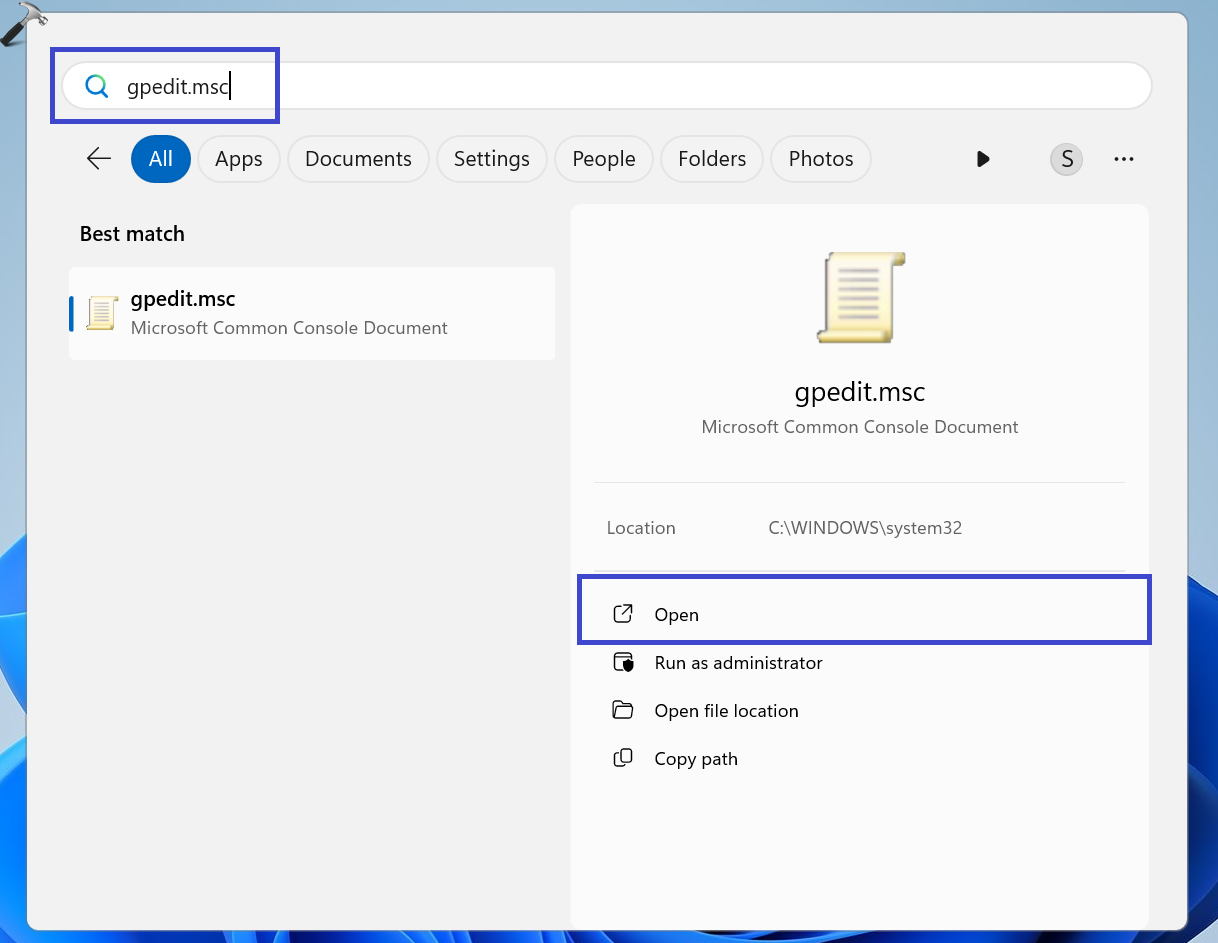 2. Geben Sie „gpedit.msc” in der Suchleiste.