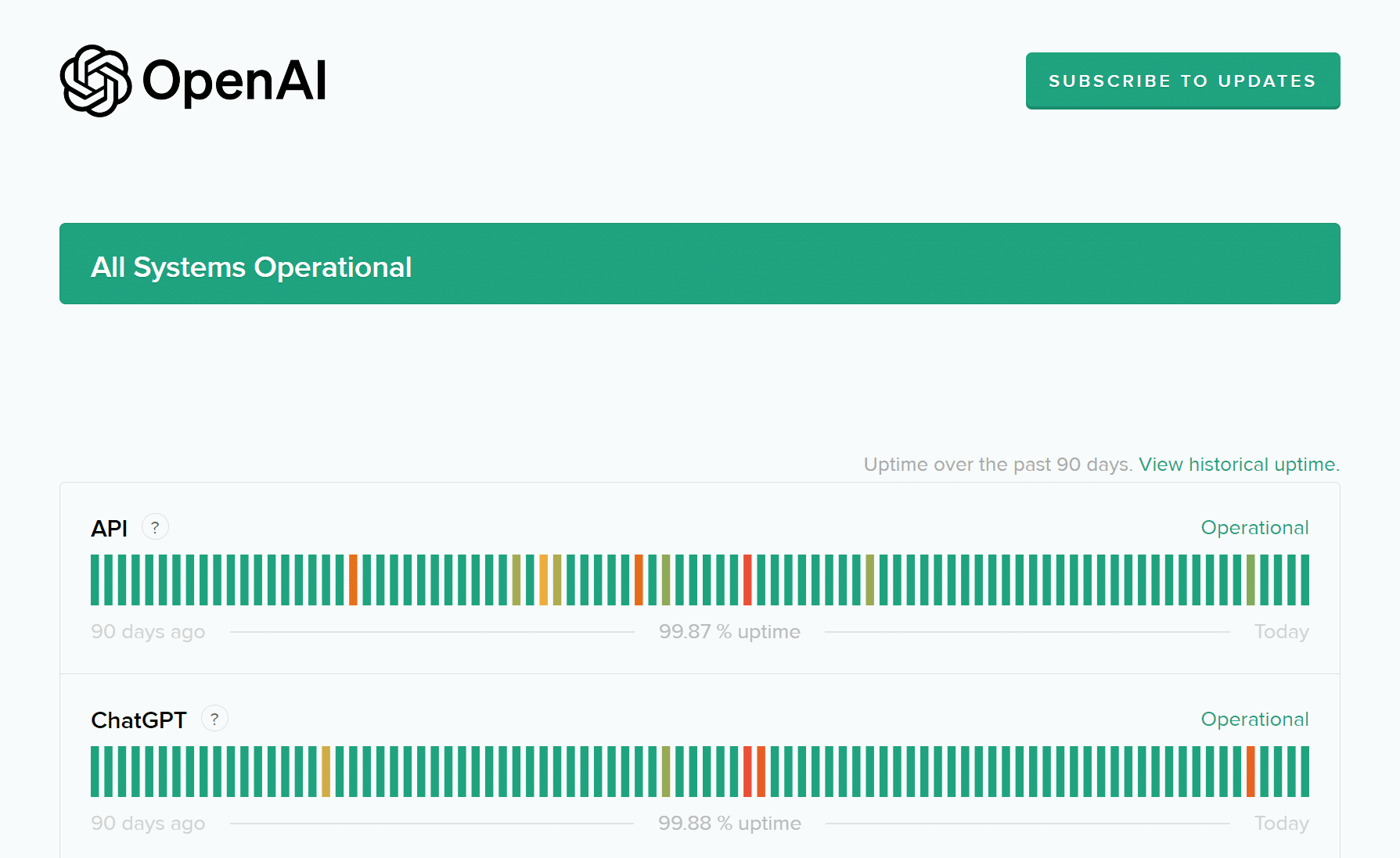 Wenn die ChatGPT-Server ausfallen, können Sie die App nicht nutzen, selbst wenn Sie über eine stabile Internetverbindung verfügen. Um zu bestätigen, dass dies nicht der Fall ist, können Sie den Serverstatus von ChatGPT unter überprüfenDie Serverstatusseite von OpenAI.