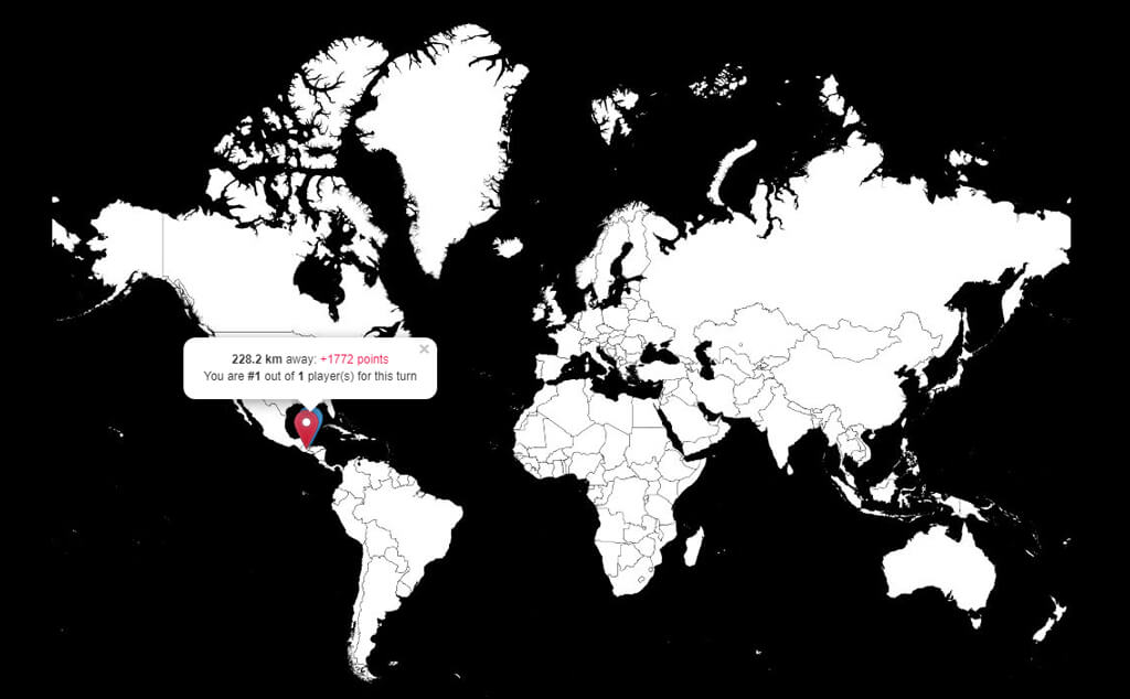 Posio ist ein Mehrspieler-Geografiespiel, bei dem Sie Städte auf einer Karte lokalisieren müssen. Nachdem Sie Ihre Vermutung abgegeben haben, sehen Sie Ihre Antwort, die richtige Antwort und die nächste Antwort, die jemand erraten hat.