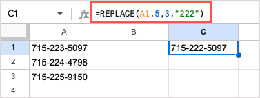Als weiteres Beispiel haben wir Telefonnummern als Text gespeichert und müssen jeweils die Vorwahl ändern. Da jedes Präfix anders ist, können wir mit REPLACE die Position und Anzahl der Zeichen für die Ersetzung angeben. Hier ist die Formel: