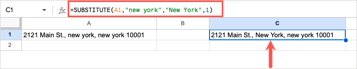 Als Beispiel für die SUBSTITUTE-Funktion möchten wir „new york“ durch „New York“ ersetzen und fügen das hinzuAuftretenArgument, um sicherzustellen, dass wir nur die erste Instanz in unserer Zeichenfolge ändern. Hier ist die Formel: