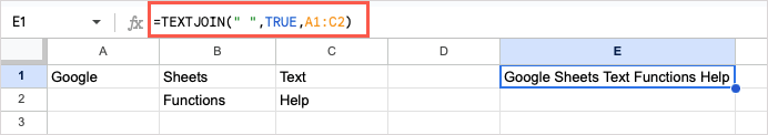 Als Beispiel verbinden wir den Text im Zellbereich A1 bis C2 mit einem Leerzeichen als Trennzeichen und TRUE, um die leere Zelle (A2) zu ignorieren. Hier ist die Formel: