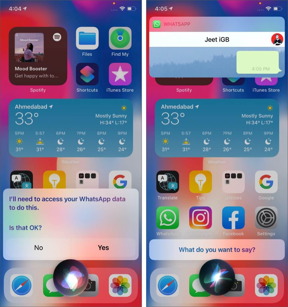 Siri wird Sie um Erlaubnis bitten, auf Ihre WhatsApp-Daten zugreifen zu dürfen. Tippen Sie aufJa. Von nun an können Sie Dinge sagen wie „Sagen Sie Donald auf WhatsApp, dass ich bis 10 Uhr morgens da bin“ oder „Rufen Sie Joe auf WhatsApp an“ und so weiter.
