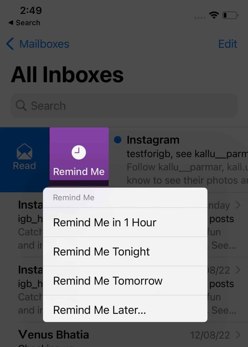 Wählen Sie dazu einfach die E-Mail aus, an die Sie erinnert werden möchten, und wischen Sie nach rechts. KlopfenErinnere mich daran→ wählen Sie ausErinnere mich in einer Stunde, erinnere mich heute Abend, oderErinnere mich morgen daran. Wählen Sie „Später erinnern“ aus, wenn Sie die Erinnerung für einen bestimmten Zeitpunkt und ein bestimmtes Datum planen möchten.