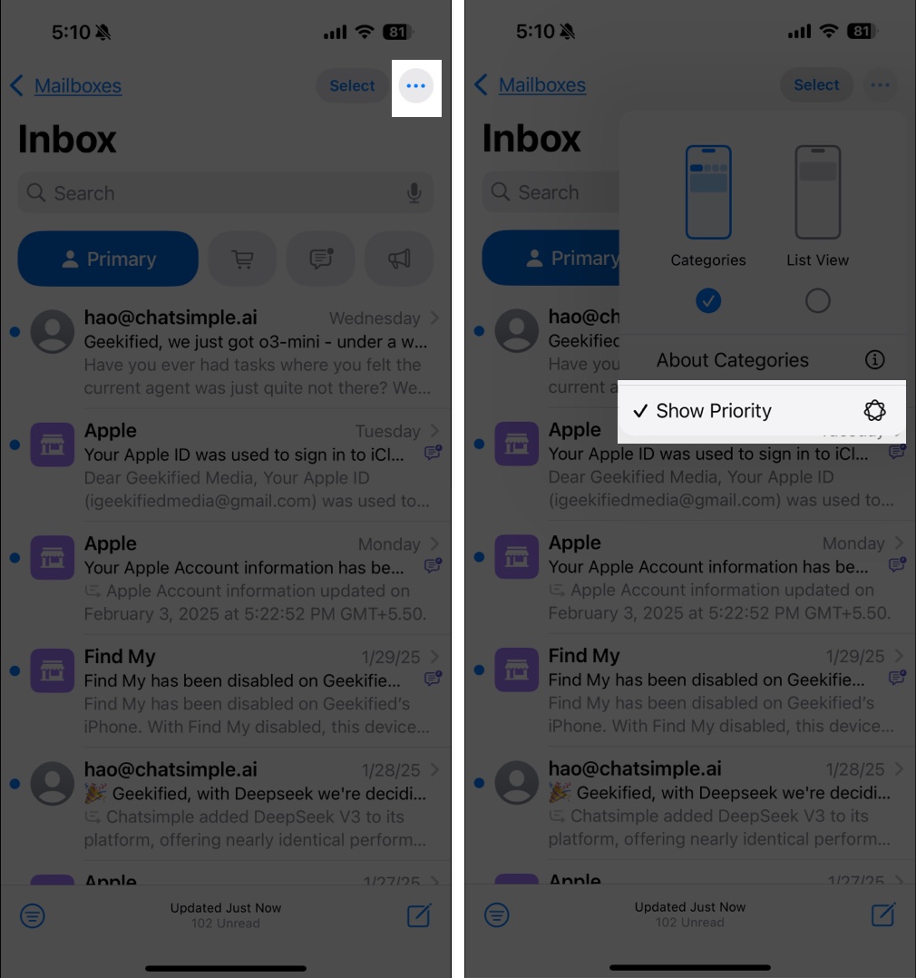 Mit iOS 18 können Sie Ihren Posteingang so einstellen, dass oben priorisierte E-Mails angezeigt werden. Wenn diese Option aktiviert ist, analysiert Apple Intelligence Ihre E-Mails und verschiebt die wichtigen E-Mails über die E-Mails, die Ihre sofortige Aufmerksamkeit nicht benötigen. So verpassen Sie nie eine dringende Mitteilung.