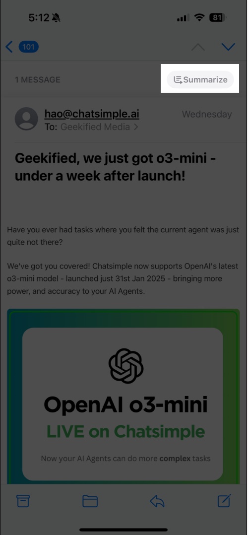Sobald Sie Apple Intelligence auf Ihrem Gerät haben, öffnen Sie eine E-Mail und tippen Sie aufZusammenfassenTaste. Es wird einige Zeit dauern, die wichtigsten Punkte aus dem E-Mail-Inhalt zu extrahieren und oben eine Zusammenfassung anzuzeigen.