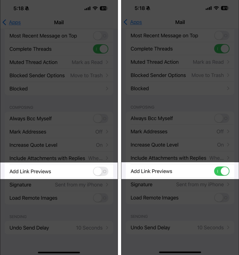 Um eine normale URL in einen Rich-Link umzuwandeln, gehen Sie zu Einstellungen → Apps → E-Mail und aktivieren Sie die Option „Linkvorschauen hinzufügen“.