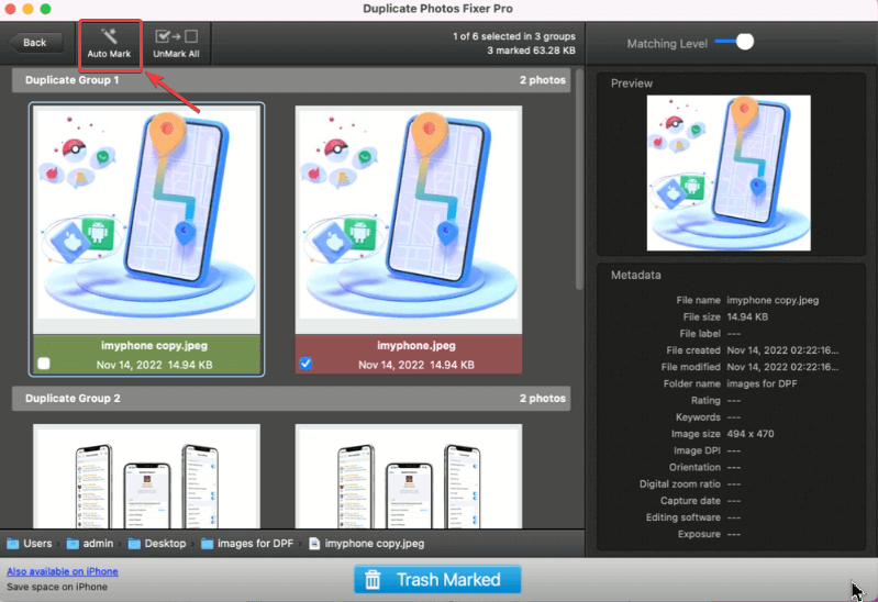 Hier ist es sinnvoll, ein Tool zum Entfernen doppelter Fotos zu verwenden. Nehmen Sie zum Beispiel Duplicate Photos Fixer Pro. Es führt einen gründlichen Scan durch und hilft dabei, exakte und ähnlich aussehende Fotos mit nur wenigen Klicks zu erkennen und zu entfernen. Duplikate werden automatisch gruppenweise angeordnet, sodass Sie in jeder Gruppe mit einem einzigen Klick ein doppeltes Foto automatisch markieren können.