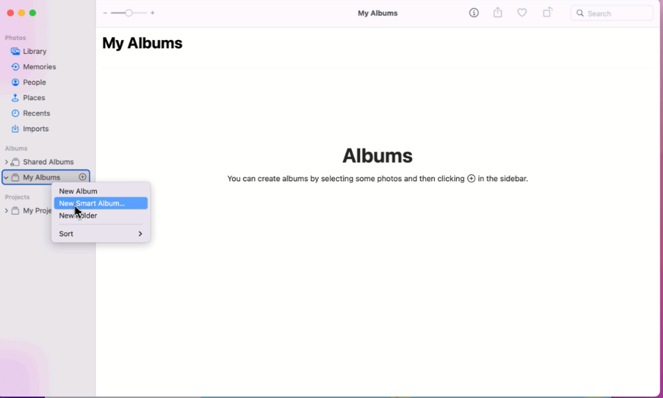 - Klicken Sie auf+Schild danebenMeine Albenoder klicken Sie mit der rechten Maustaste daraufMeine Albenund klicken Sie aufNeues Smart-Album, und geben Sie ihm einen Namen.