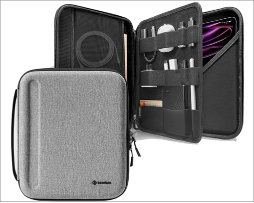 Eine weitere Option, wenn Sie ein kleines Extra wünschen, ist die Tomtoc Portfolio-Hülle – oder beispielsweise eine Aktentasche für Ihr iPad Pro. Diese Hülle bietet nicht nur einen speziellen Platz für das iPad, sondern verfügt auch über verschiedene Fächer zur Aufbewahrung des Ladegeräts, der Kabel oder anderer Geräte (wie im Bild gezeigt). Dies ist ideal für Benutzer, die möchten, dass ihre Peripheriegeräte an einem sicheren Ort organisiert bleiben.