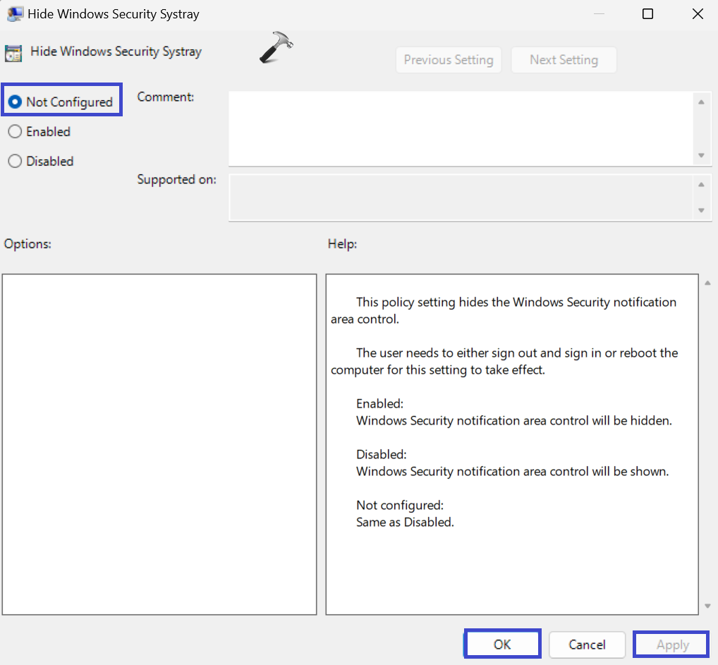 4. Ein Dialogfeld wird angezeigt. Wählen "Nicht konfiguriert”, um das Windows-Sicherheitssymbol hinzuzufügen.