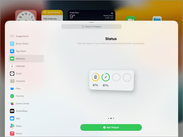 Wie tragisch wäre es, wenn der Akku leer wäre, wenn Sie den Apple Pencil am meisten brauchen? Sie können zwar zu Einstellungen → Apple Pencil gehen, um den Akku zu überprüfen, am besten geht es jedoch über das Akku-Widget.