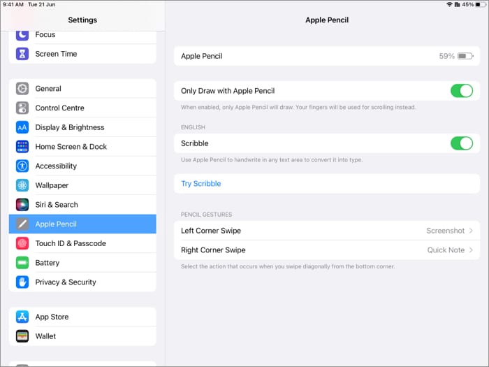Standardmäßig ist die Palm Rejection beim Apple Pencil aktiviert, d. h. wenn Ihre Handfläche den Bildschirm berührt, während Sie den Apple Pencil verwenden, wird dies nicht registriert.