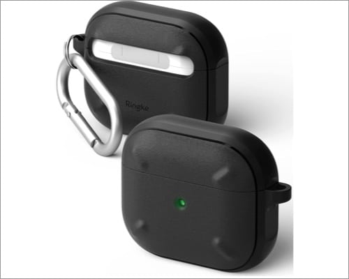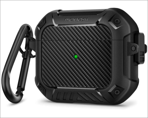 Benötigen Sie eine robuste AirPods 3-Hülle, die allen Höhen und Tiefen des Lebens standhält? Schauen Sie sich diesen MOBOSI-Dornkoffer mit stoßfesten Ecken an, der Rundumschutz bietet. Es verfügt über ein sicheres Sicherheitsschloss, um das AirPods-Ladeetui fest verschlossen zu halten. Das Carbonfaser-Finish sorgt außerdem für einen stilvollen Look.
