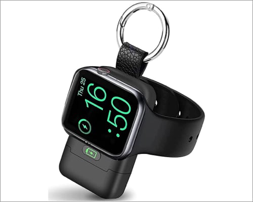 Darüber hinaus verfügt das Ladegerät über eine leichte Bauweise und eine kompakte Größe, sodass Sie es ohne Belastung in der Hand halten können. Mit der Trageschlaufe können Sie das Ladegerät an einen Haken oder eine Kette Ihrer Tasche hängen. Vertrauen Sie mir, wenn Sie ein vergessliches Wesen wie ich sind, wird das Schlüsselanhänger-Design Sie davor bewahren, Ihr Apple Watch-Ladegerät zu vergessen oder zu verlieren.