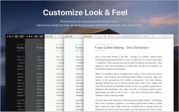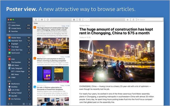 Dieser kostenpflichtige Reader für Mac unterstützt Dienste wie Readability, Pocket, Instapaper usw. Sie können diese Dienste verwenden, um Geschichten zu organisieren und zu speichern, die Sie später lesen möchten. Die App bietet auch die Möglichkeit, eine Story über die Benutzeroberfläche zu starten.