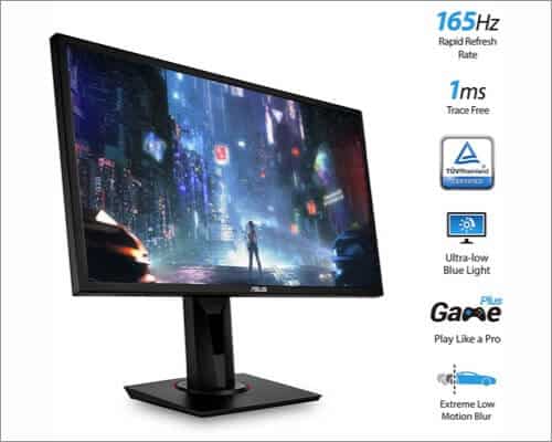Der ASUS ist ein weiterer preisgünstiger Gaming-Monitor, der die Nvidia G-SYNC-Technologie unterstützt. Es verfügt über eine Full-HD-Auflösung und eine beeindruckende Bildwiederholfrequenz von 165 Hz, die Sie nur erleben können, wenn Sie es persönlich sehen. Obwohl das Design etwas veraltet erscheint, machen die Reaktionszeit von 0,5 ms und die speziellen Funktionen zur Augenpflege das wieder wett.