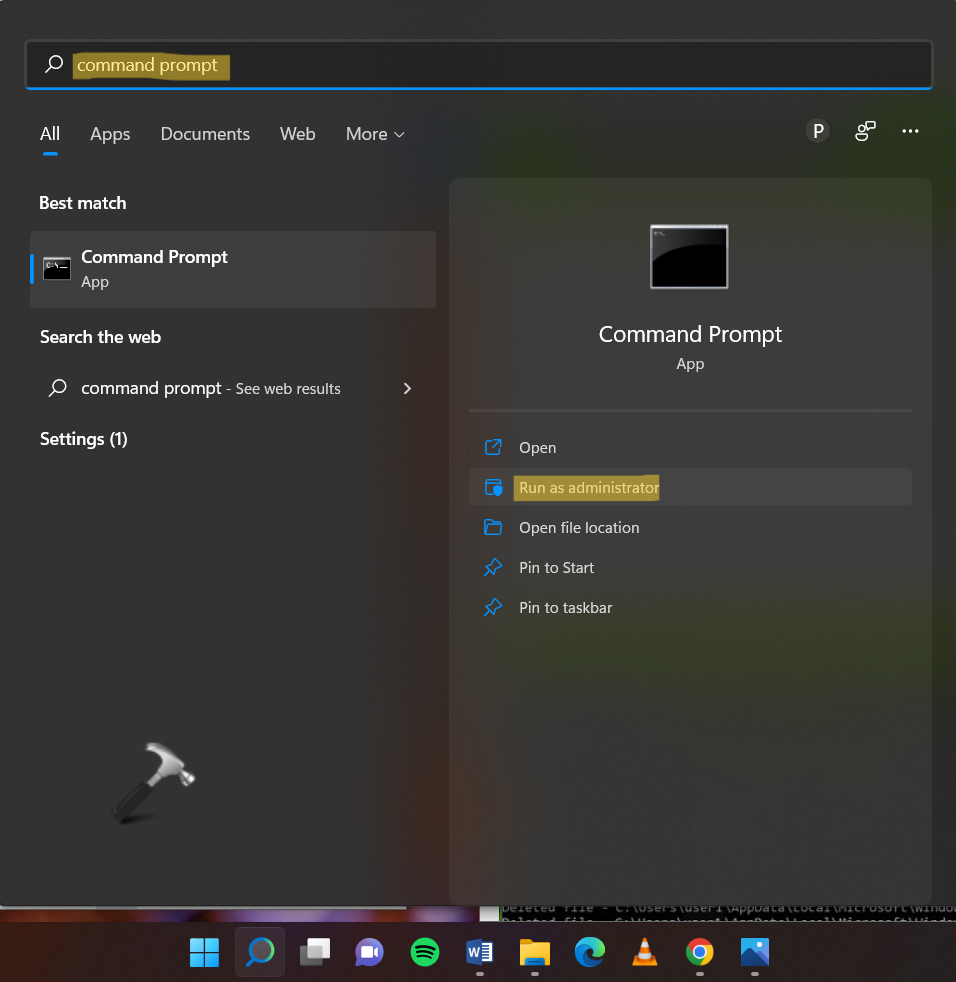 1.Zunächst einmal öffnenWindows-Sucheund TypEingabeaufforderung. Klicken Sie anschließend aufAls Administrator ausführen, um die Eingabeaufforderung mit erhöhten Rechten zu öffnen.