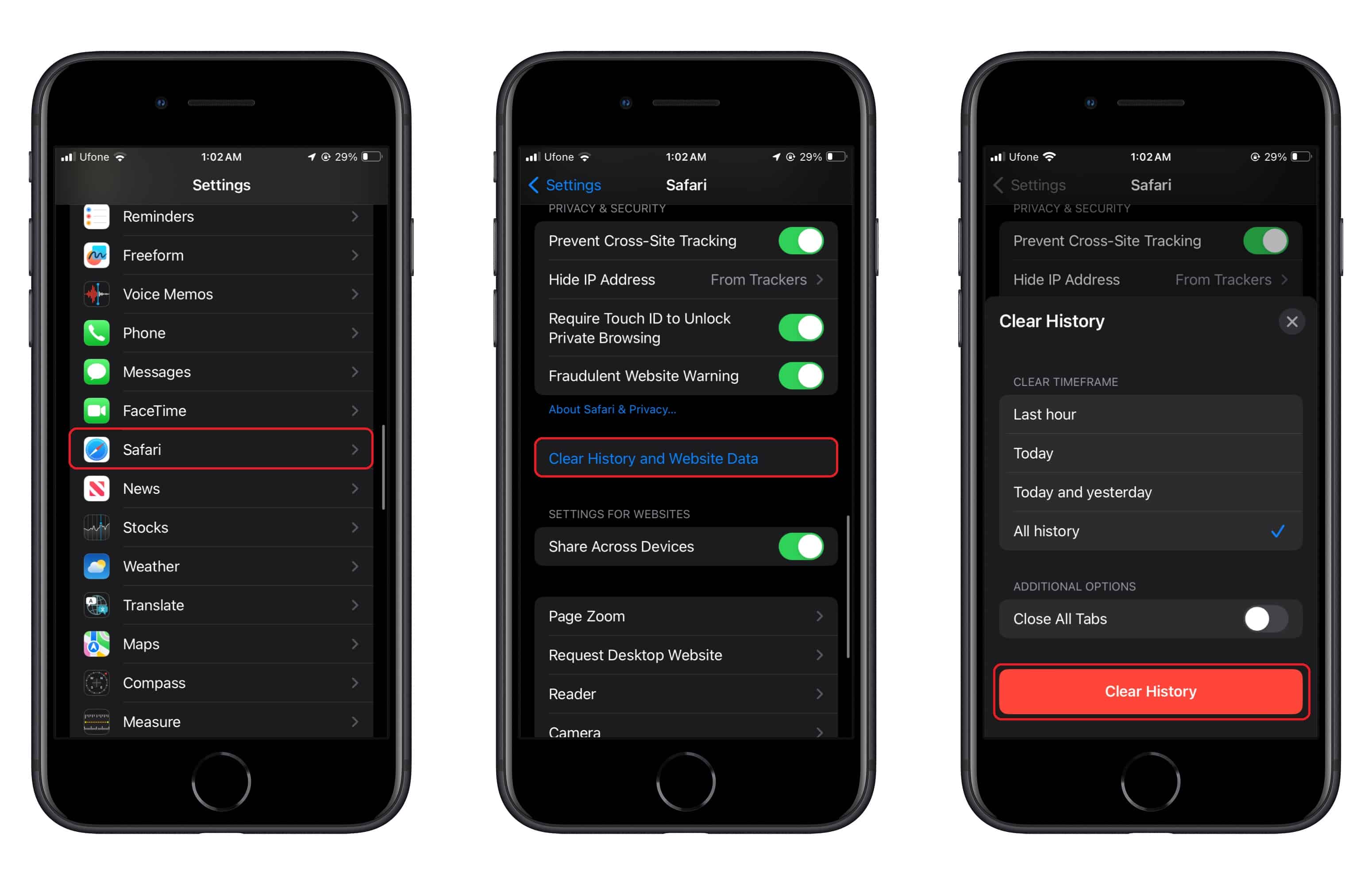 - Scrollen Sie in den Safari-Einstellungen nach unten, bis Sie das findenDatenschutz und Sicherheity-Option. Um alle Cookies und Website-Daten zu löschen, tippen Sie aufVerlauf und Website-Daten löschen.