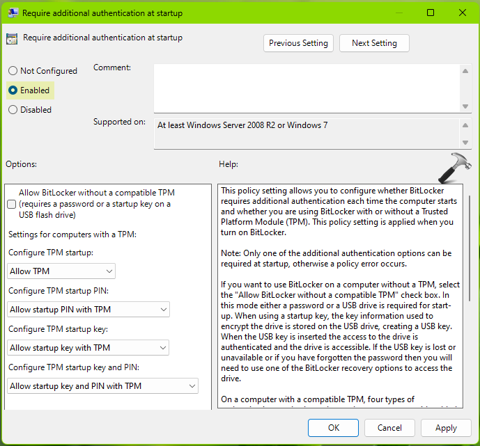 4.Wählen Sie im Richtlinienkonfigurationsfenster ausErmöglicht. Deaktivieren Sie unter „Optionen“ das KontrollkästchenErlauben Sie BitLocker ohne kompatibles TPM. Lassen Sie die übrigen Optionen unverändert, wie sie standardmäßig sind. Klicken Sie auf Übernehmen und anschließend auf OK.