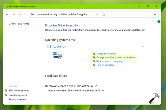 6.Klicken Sie mit der rechten Maustaste auf Ihr BitLocker-verschlüsseltes Betriebssystemlaufwerk und wählen SieWeitere Optionen anzeigen, dann auswählenBitLocker verwalten. Klicken Sie im nächsten Fenster aufÄndern Sie, wie das Laufwerk beim Start entsperrt wird.