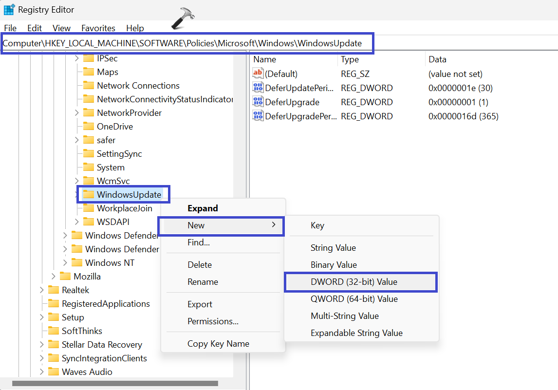 3. Klicken Sie nun mit der rechten Maustaste auf „WindowsUpdate„Registrierungsschlüssel“ und wählen Sie „Neu => DWORD-Wert (32-Bit).“.