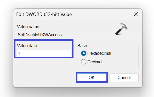 Typ "SetDisableUXWAccess” und klicken Sie auf OK.
