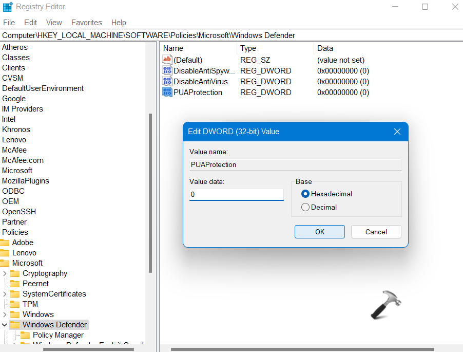 3.Sobald Sie dort sind, doppelklicken Sie aufPUASchutzREG_DWORD und ändern Sie seine Wertdaten in1um den Microsoft Defender PUA-Schutz zu aktivieren.