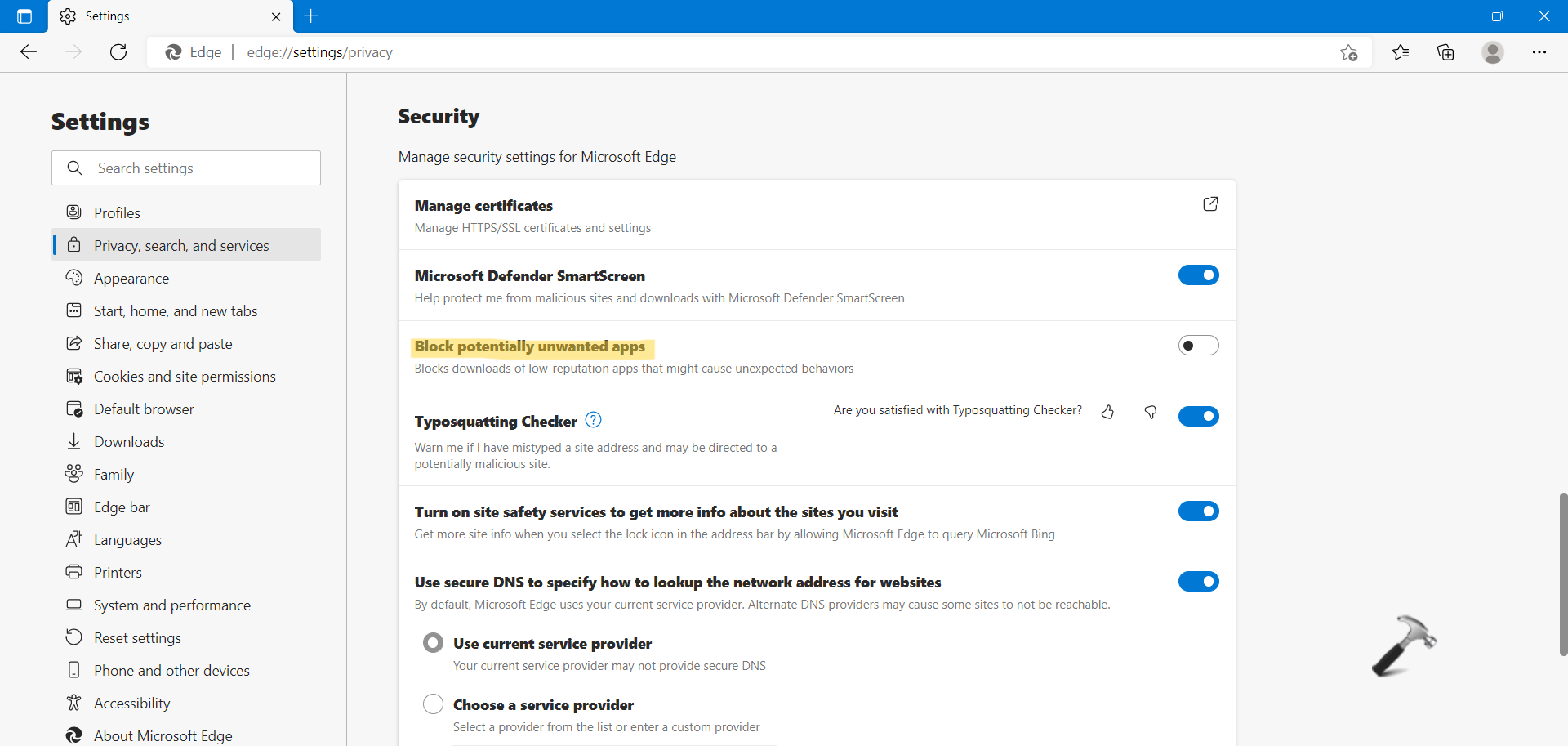 2.Klicken Sie anschließend aufDatenschutz, Suche und Diensteauf der linken Seite vorhanden. Aktivieren Sie auf der Registerkarte „Sicherheit“.Blockieren Sie potenziell unerwünschte Appsum den PUA-Schutz zu aktivieren.