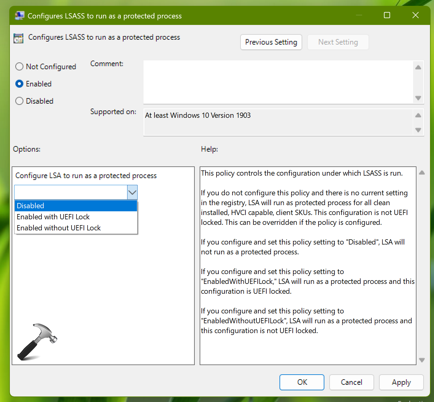 4. Setzen Sie nun den Richtlinienstatus aufErmöglichtund für Optionen, für dieKonfigurieren Sie LSA so, dass es als geschützte Prozessoption ausgeführt wird, wählen Sie Ihre gewünschte Option. Klicken Sie auf Übernehmen, OK.