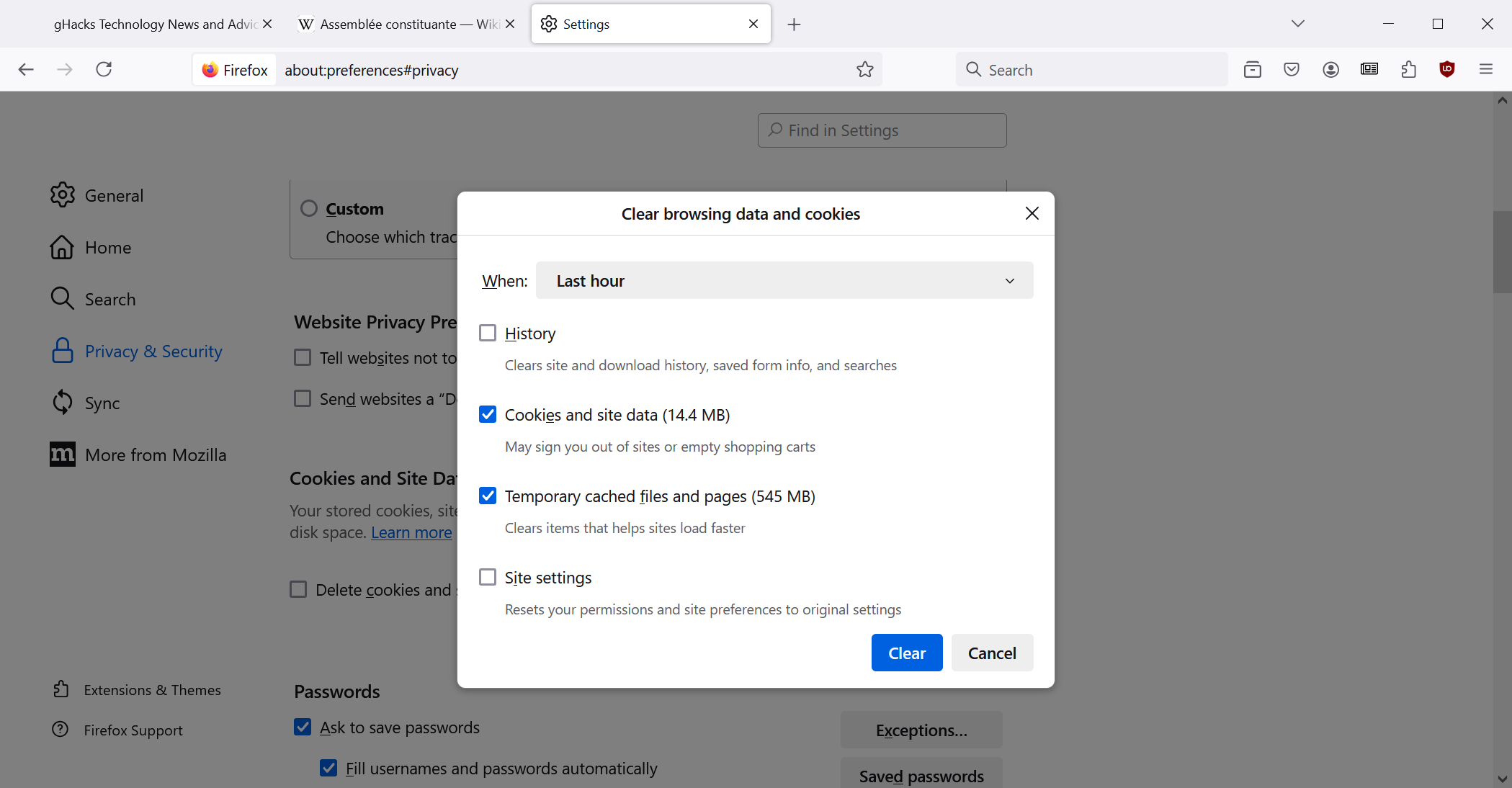 Mozilla hat den Dialog „Browserdaten und Cookies löschen“ im Firefox-Webbrowser geändert. Sie können darauf zugreifen, indem Sie zu Menü > Einstellungen > Datenschutz und Sicherheit > Cookies und Websitedaten > Daten löschen gehen.