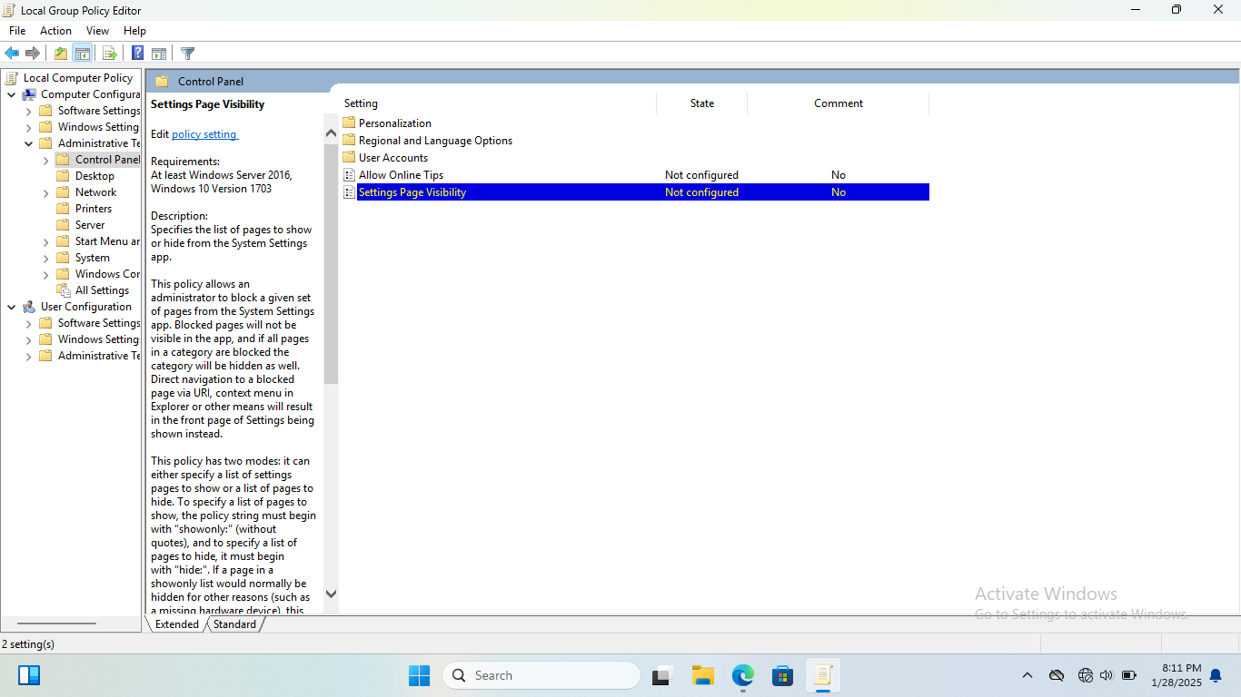 Beim Vornehmen von Anpassungen im Gruppenrichtlinien-Editor kann es manchmal passieren, dass die Anzeigeseite versehentlich deaktiviert wird. Um dies zu überprüfen,