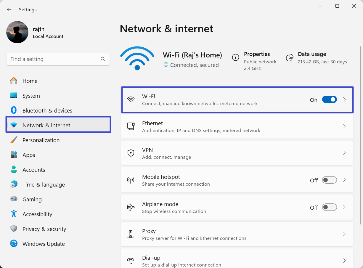 2. Gehen Sie zu „Netzwerk & Internet”Einstellungen und wählen Sie Ihren Verbindungstyp (Ethernet, WLAN,usw.).