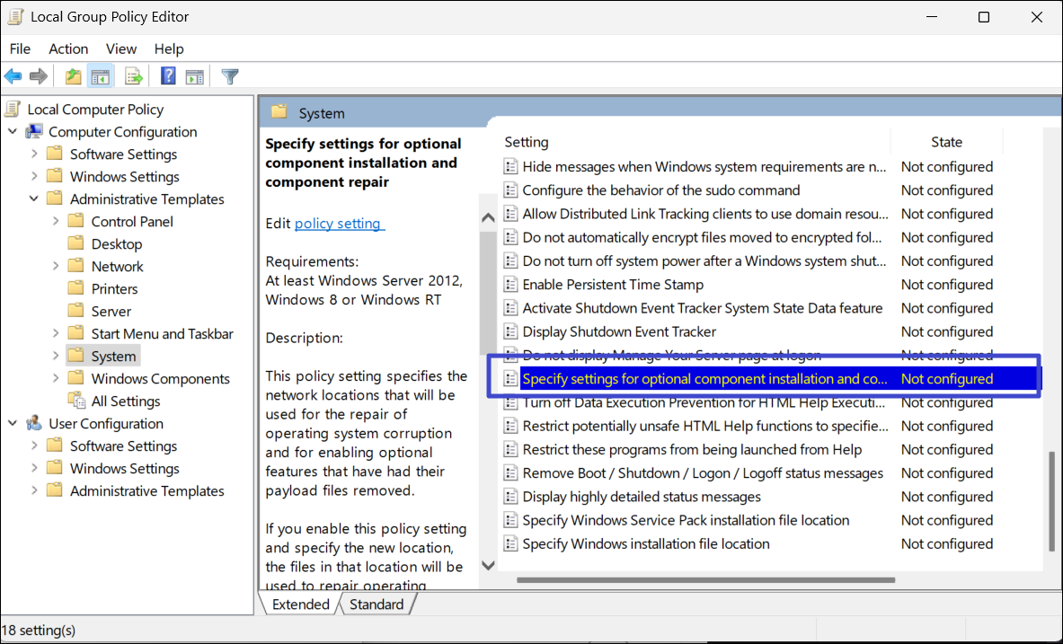 3. Suchen Sie das Symbol „ und doppelklicken Sie darauf.Geben Sie Einstellungen für die optionale Komponenteninstallation und Komponentenreparatur an" Einstellung.