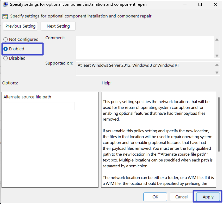 4. Ändern Sie die Einstellung auf „Ermöglicht"und klicken Sie auf „Anwenden", Dann "OK“.