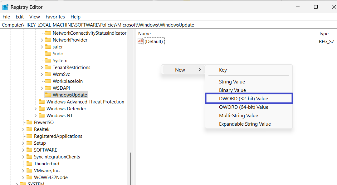 5. Auf der rechten SeiteWindowsUpdateTaste, prüfen Sie, ob die „„DoNotConnectToWindowsUpdateInternetLocations“DWORD existiert. Wenn dies nicht der Fall ist, klicken Sie mit der rechten Maustaste auf eine leere Stelle und wählen Sie „Neu” > “DWORD-Wert (32-Bit).“.