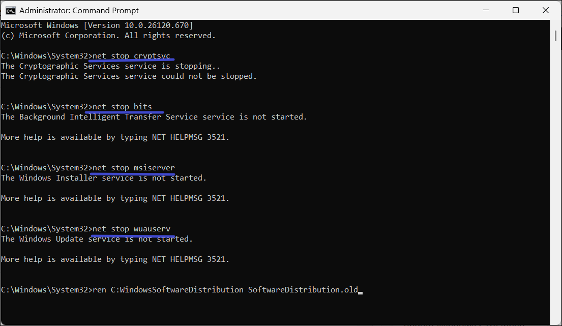 Ren %systemroot%SoftwareDistribution SoftwareDistribution.bak