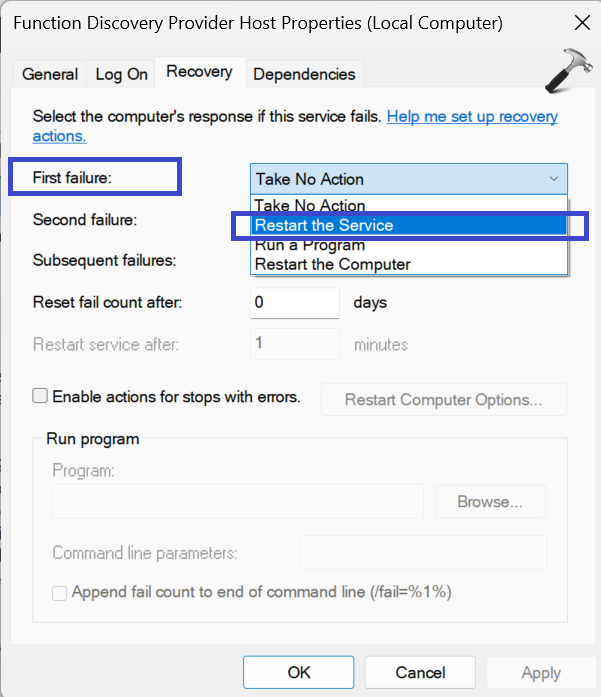6. Neben „Erster Misserfolg„, scrollen Sie nach unten und wählen Sie“NeustartDieService”-Option.